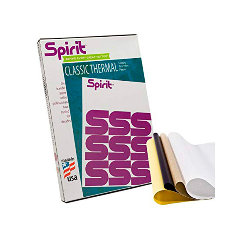 Es un papel termico utilizado para trasnferir diseños de tatuajes a la piel con facilidad y precision, de gran resitencia y duracion. El beneficio de utilizar Spirit es que produce una imagen nitida y clara para facilitar la transferencia.